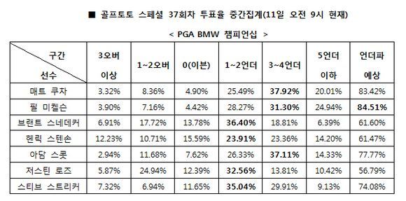 지정 선수별 1라운드 예상 스코어에서는 매트 쿠차(37.92%), 아담 스콧(37.11%), 필 미켈슨(31.30%)의 3~4언더파 예상이 차례로 높게 집계된 가운데, 브랜트 스네데커(36.40%), 스티브 스트리커(35.04%), 저스틴 로즈(32.56%), 헨릭 스텐손(23.91%)은 1~2언더파를 기록할 것이란 예상이 높게 집계됐다.