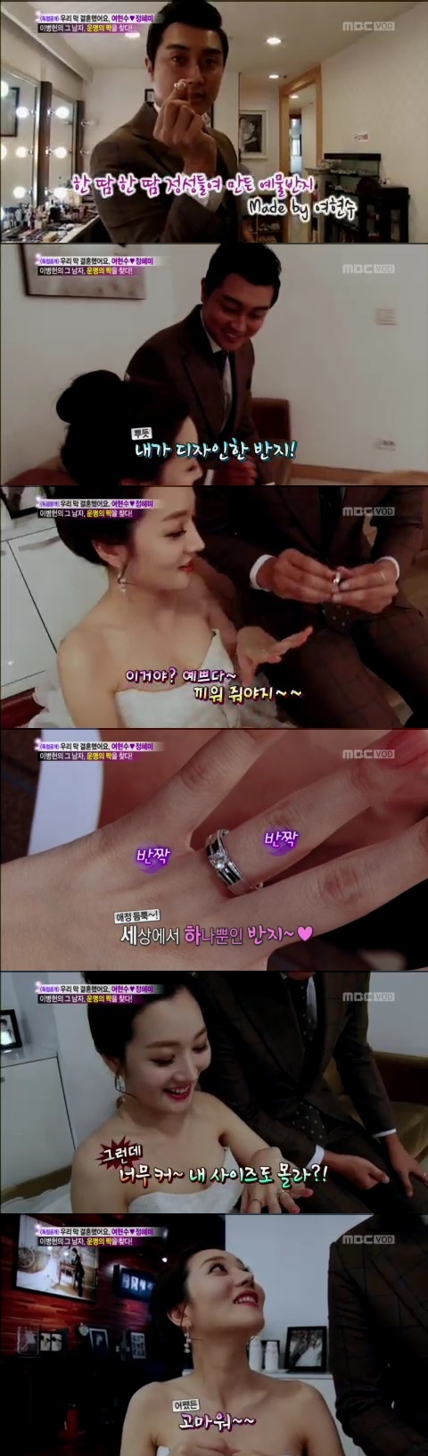 여현수는 “아내에게 특별한 것을 해주고 싶었다”며 “그런데 요즘은 예물로 많은 것을 하지 않고 반지 하나만 하니까 준비를 해봤다”고 정하윤을 위해 직접 디자인한 반지를 선보였다.