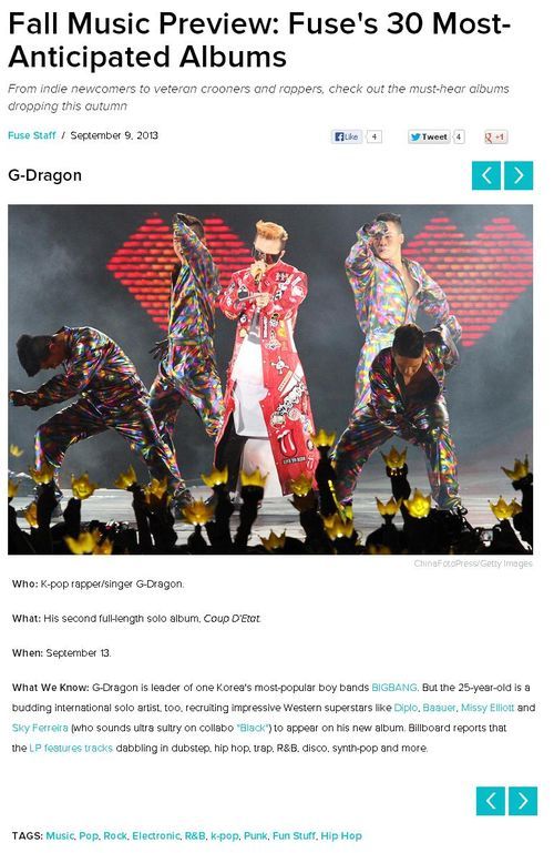 그룹 빅뱅의 리더 지드래곤이 미국 퓨즈TV(FUSE TV)가 추천하는 가을 기대 음악 30에 꼽혔다.