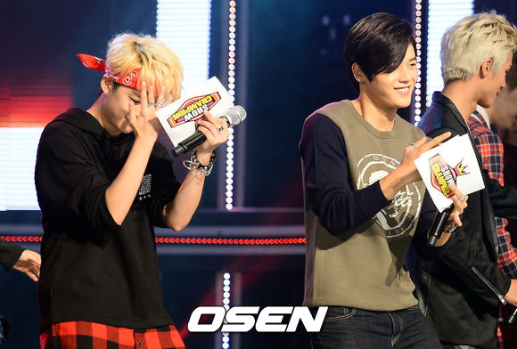 11일 오후 서울 유니클로 악스홀에서 진행된 MBC MUSIC '쇼 챔피언'에서 엠버와 동준이 챔피언송을 차지한 틴탑 춤을 추고 있다.