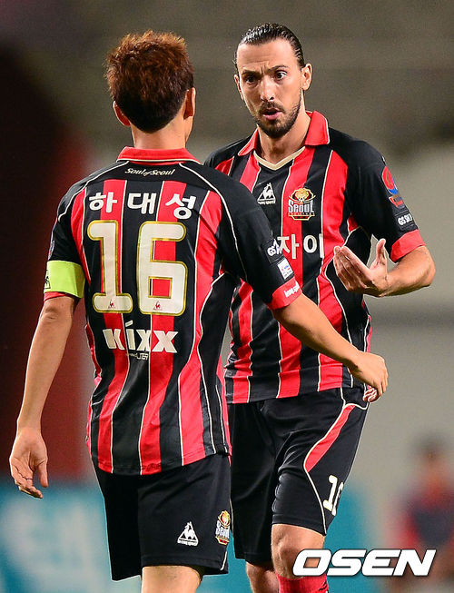 11일 오후 서울 상암동 서울월드컵경기장에서 열린 '현대오일뱅크 K리그 클래식 2013' FC 서울과 포항 스틸러스의 경기 전반 FC 서울 데얀과 하대성이 이야기를 나누고 있다.