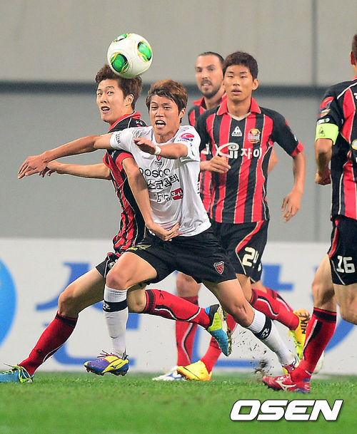 11일 오후 서울 상암동 서울월드컵경기장에서 열린 '현대오일뱅크 K리그 클래식 2013' FC 서울과 포항 스틸러스의 경기 전반 FC 서울 고명진과 포항 김승대가 볼 다툼을 벌이고 있다.