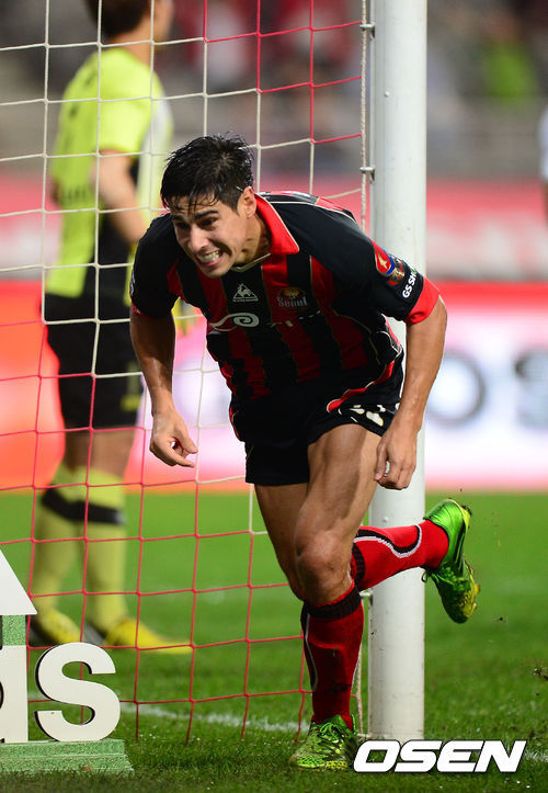 11일 오후 서울 상암동 서울월드컵경기장에서 열린 '현대오일뱅크 K리그 클래식 2013' FC 서울과 포항 스틸러스의 경기 후반 FC 서울 몰리나가 선제골을 넣은 뒤 기뻐하고 있다.