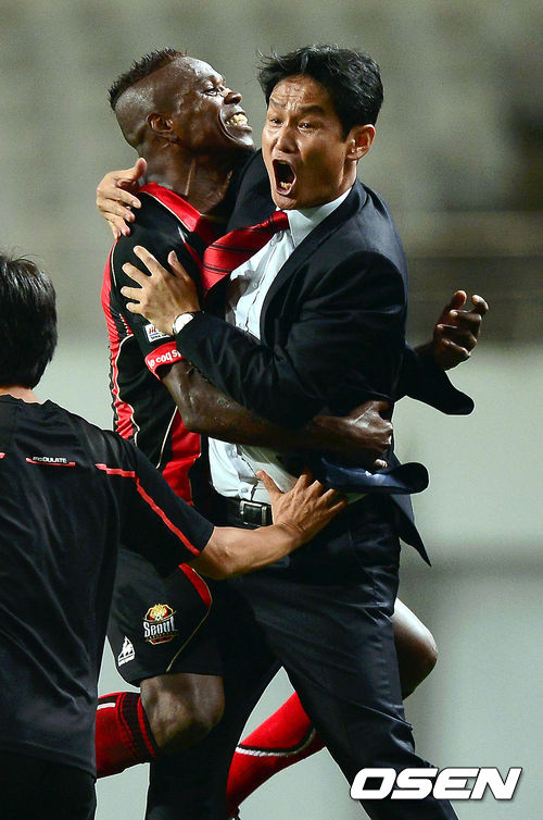 11일 오후 서울 상암동 서울월드컵경기장에서 열린 '현대오일뱅크 K리그 클래식 2013' FC 서울과 포항 스틸러스의 경기 후반 FC 서울 최용수 감독이 고명진이 추가골을 넣자 아디와 기뻐하고 있다.