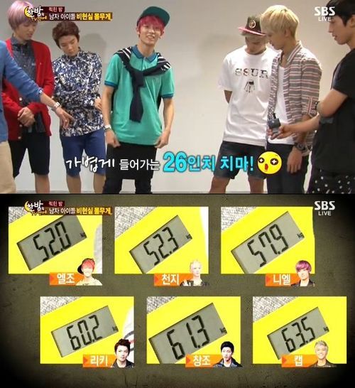 11일 오후 8시 55분 방송된 SBS '한밤의 TV연예'에는 경량 아이돌 틴탑이 직접 몸무게를 재는 모습을 담았다.