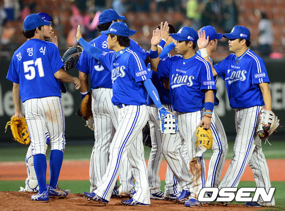 11일 오후 서울 목동구장에서 열린 '2013 한국야쿠르트 세븐 프로야구' 넥센 히어로즈와 삼성 라이온즈 경기 종료 후 선수들이 하이파이브를 하고 있다.