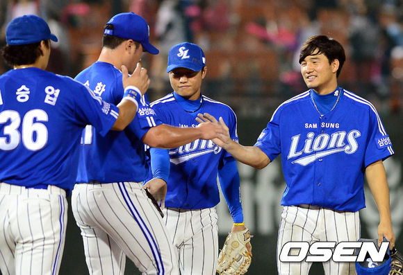 11일 오후 서울 목동구장에서 열린 '2013 한국야쿠르트 세븐 프로야구' 넥센 히어로즈와 삼성 라이온즈 경기 종료 후 삼성 선수들이 하이파이브를 하고 있다.