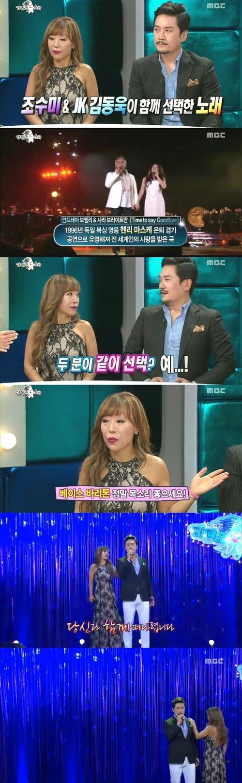 조수미와 JK김동욱은 11일 오후 방송된 MBC 예능프로그램 '황금어장-라디오스타'에 출연, ‘time to say goodbye’를 함께 불러 엔딩 무대를 장식했다.
