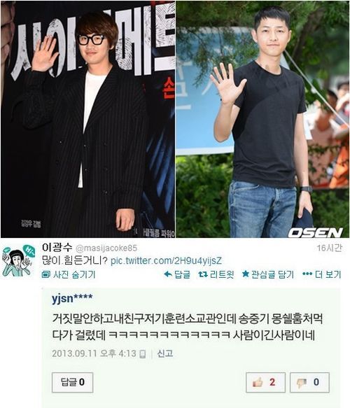 공개된 사진에는 "거짓말 안하고 내 친구 저기 훈련소 교관인데 송중기 몽쉘 훔쳐 먹다가 걸렸대. 사람이긴 사람이네"라고 적힌 댓글이 담겨있다. 이에 이광수는 송중기를 향해 장난스런 위로를 보낸 것.