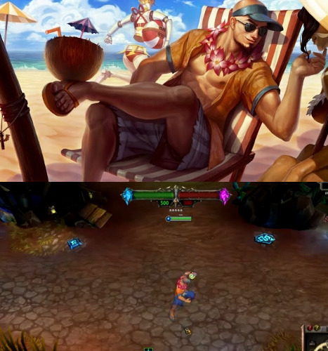 수영장파티 리신 스킨은 이미 북미 서버 등을 통해 소개돼 많은 롤팬들로부터 인기를 모으고 있다. 새로운 수영장파티 스킨 속 리신은 뜨거운 태양이 비치는 해변가 파라솔 아래 선베드에 기대앉아서 일광욕을 즐기는 모습이다.