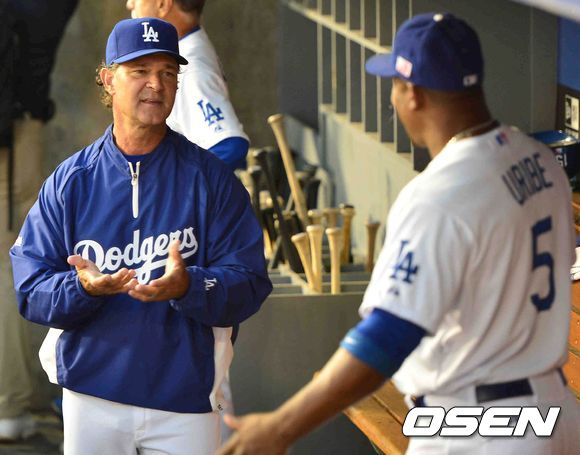 12일 (이하 한국시간) 미국 캘리포니아주 로스앤젤레스 다저스타디움에서 열린 2013 메이저리그 LA 다저스와 애리조나 다아아몬드백스의 경기 선발명단에서 빠진 유리베가 매팅리 감독과 이야기를 나누고 있다.