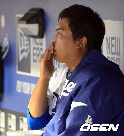 12일 (이하 한국시간) 미국 캘리포니아주 로스앤젤레스 다저스타디움에서 열린 2013 메이저리그 LA 다저스와 애리조나 다아아몬드백스의 경기 류현진이 더그아웃에서 생각에 잠겨있다.