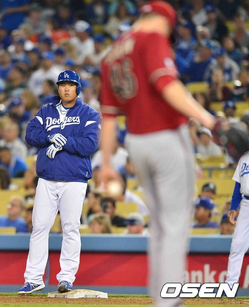 12일 (이하 한국시간) 미국 캘리포니아주 로스앤젤레스 다저스타디움에서 열린 2013 메이저리그 LA 다저스와 애리조나 다아아몬드백스의 경기 4회말 2사 1루 류현진이 안타를 치고 1루에 진루했다.