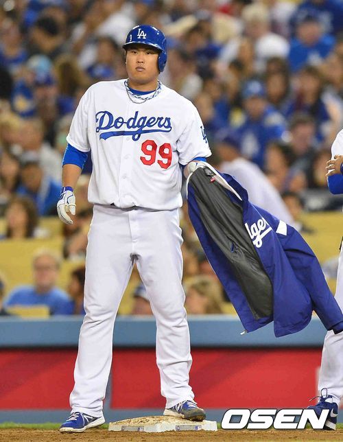 12일 (이하 한국시간) 미국 캘리포니아주 로스앤젤레스 다저스타디움에서 열린 2013 메이저리그 LA 다저스와 애리조나 다아아몬드백스의 경기 4회말 2사 1루 류현진이 안타를 치고 1루에 진루했다.