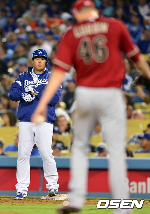 12일 (이하 한국시간) 미국 캘리포니아주 로스앤젤레스 다저스타디움에서 열린 2013 메이저리그 LA 다저스와 애리조나 다아아몬드백스의 경기 4회말 2사 1루 류현진이 안타를 치고 1루에 진루 코빈을 바라보고 있다.