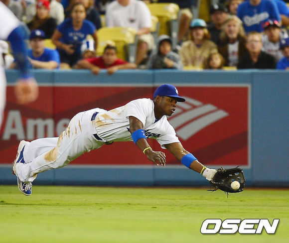 12일 (이하 한국시간) 미국 캘리포니아주 로스앤젤레스 다저스타디움에서 열린 2013 메이저리그 LA 다저스와 애리조나 다이몬드 백스 경기, 6회초 2사 애리조나 오윙스의 타구를 다저스 우익수 푸이그가 몸을 날리며 다이빙캐치를 하고 있다.