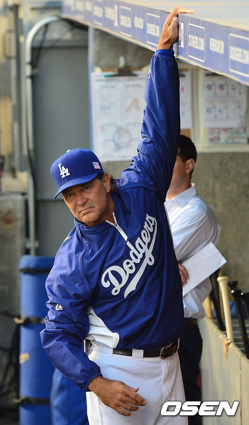 다저스 돈 매팅리 감독이 덕아웃에서 몸을 풀고 있다. / rumi@osen.co.kr