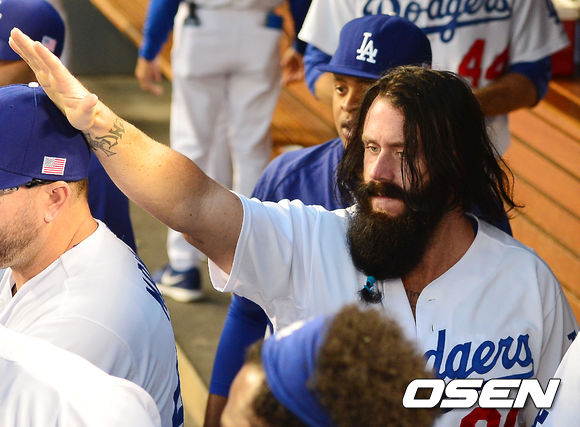다저스 덕아웃에서 윌슨이 동료들과 하이파이브를 하고 있다. / rumi@osen.co.kr
