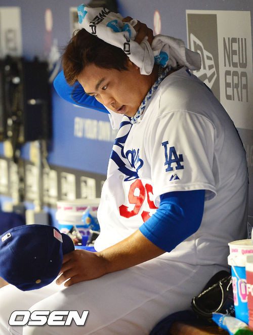 교체된 다저스 류현진이 아쉬운 표정으로 땀을 닦고 있다. / rumi@osen.co.kr