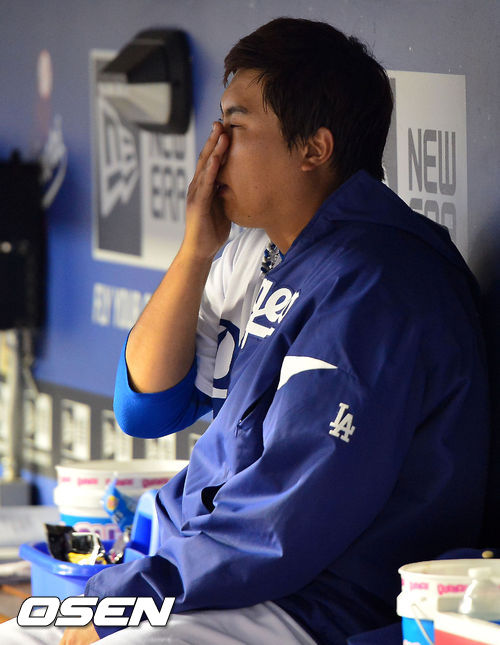 4회를 마친 다저스 류현진이 덕아웃에서 아쉬운 표정을 짓고 있다. / rumi@osen.co.kr