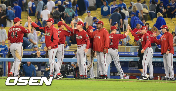 경기를 마치고 승리를 거둔 애리조나 선수들이 코치진들과 하이파이브를 하고 있다. / rumi@osen.co.kr