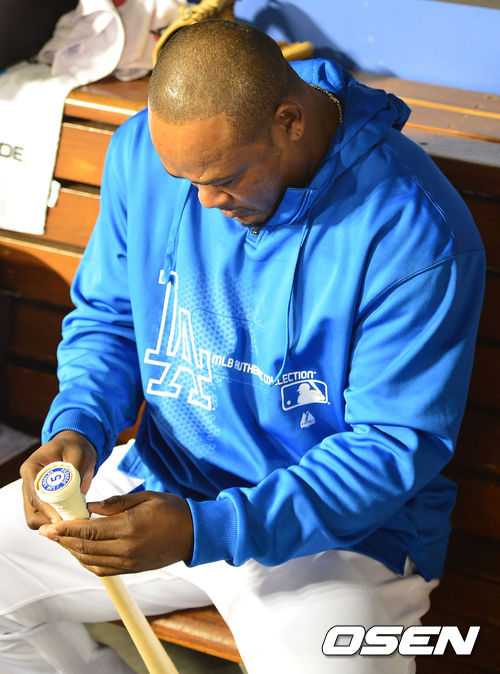 4회에 다저스 유리베가 배트에 테이핑을 하고 있다. / rumi@osen.co.kr