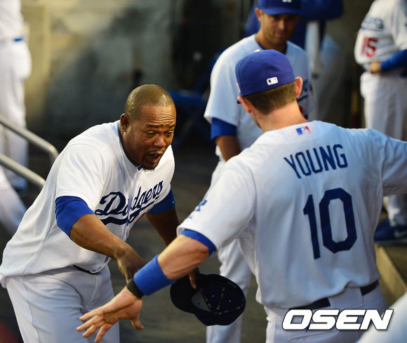 덕아웃에서 마이클 영과 유리베가 하이파이브를 하고 있다. / rumi@osen.co.kr