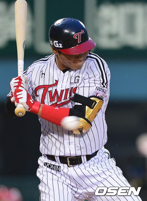 1회말 LG 공격 1사 주자없는 상황 2번타자 권용관이 KIA 선발 임준섭의 공에 몸을 스치듯 맞고 있다. 권용관은 1루 출루.