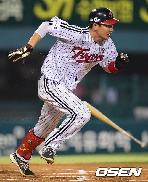 2회말 LG 공격 2사 3루 상황, 9번 손주인이 1타점 우전안타를 날리고 1루를 향해 뛰고 있다.