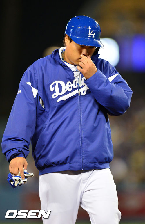 4회말 2사 1, 2루 다저스 야시엘 푸이그의 유격수 땅볼로 이닝이 마무리 되자 1루주자 류현진이 덕아웃으로 들어오고 있다. / rumi@osen.co.kr