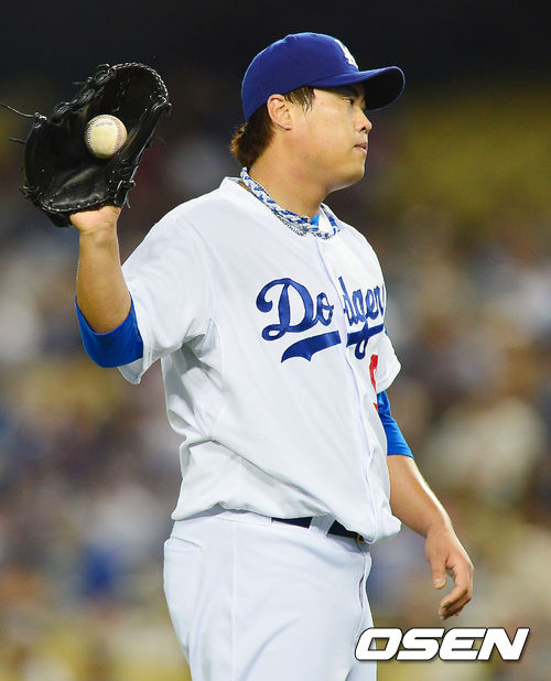 2회초 1사 주자 3루 고스비쉬에게 좌전 2루타를 맞아 실점한 다저스 류현진이 아쉬운 표정을 짓고 있다. / rumi@osen.co.kr
