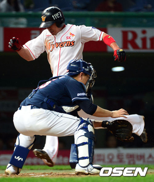 12일 오후 인천 문학구장에서 '2013 한국야쿠르트 세븐 프로야구' SK 와이번스와 두산 베어스의 경기, 6회말 무사 1,2루 SK 김강민이 1타점 적시타 때 2루주자 최정이 득점을 올리고 있다.