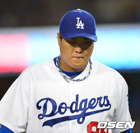 다저스 선발 류현진이 4회를 마친 후 입술을 깨문채 덕아웃으로 들어오고 있다. / rumi@osen.co.kr