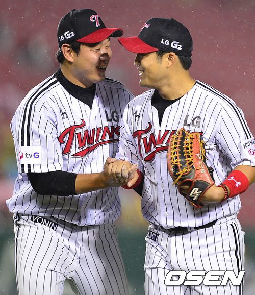 6회초 KIA 공격 2사 3루 상황 이종환을 좌익수플라이로 처리하며 이닝을 마친 LG 선발 류제국이 좌익수 정의윤과 인사를 나누며 더그아웃으로 들어오고 있다.