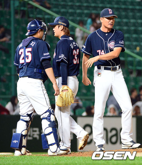 12일 오후 인천 문학구장에서 '2013 한국야쿠르트 세븐 프로야구' SK 와이번스와 두산 베어스의 경기, 6회말 무사 1,2루 두산 김선우가 SK 김강민에게 실점을 허용한 뒤 강판되고 있다.