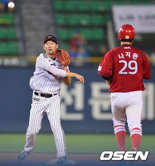 6회초 KIA 공격 무사 1, 2루 상황 이범호의 내야 땅볼 때 LG 2루수 손주인이 주자 나지완을 포스아웃 시킨 뒤 1루로 송구하고 있다.