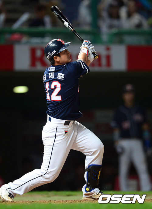 12일 오후 인천 문학구장에서 '2013 한국야쿠르트 세븐 프로야구' SK 와이번스와 두산 베어스의 경기, 9회초 무사 1,2루 두산 최재훈이 SK 윤길현 상대로 좌측 담장을 넘기는 3점 홈런을 때리고 있다.