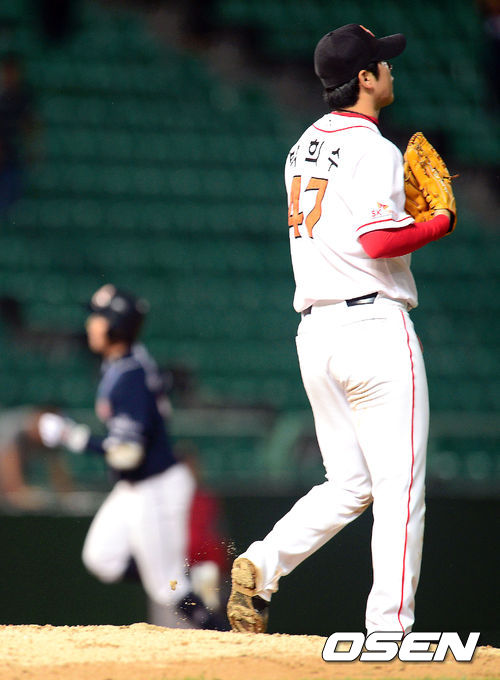 12일 오후 인천 문학구장에서 '2013 한국야쿠르트 세븐 프로야구' SK 와이번스와 두산 베어스의 경기, 9회초 2사 1,2루 SK 박희수가 두산 김동한에게 역전 스리런을 허용한 뒤 아쉬워하고 있다.