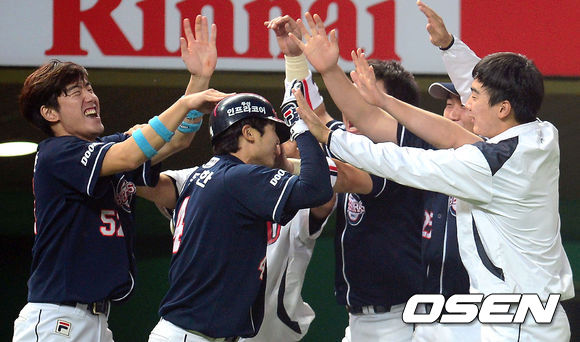 12일 오후 인천 문학구장에서 '2013 한국야쿠르트 세븐 프로야구' SK 와이번스와 두산 베어스의 경기, 9회초 2사 1,2루 두산 김동한이 SK 박희수를 상대로 역전 스리런 홈런을 때린 뒤 동료들에게 축하받고 있다.