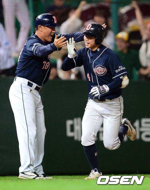 12일 오후 인천 문학구장에서 '2013 한국야쿠르트 세븐 프로야구' SK 와이번스와 두산 베어스의 경기, 9회초 2사 1,2루 두산 김동한이 SK 박희수를 상대로 역전 스리런 홈런을 때린 뒤 기뻐하고 있다.