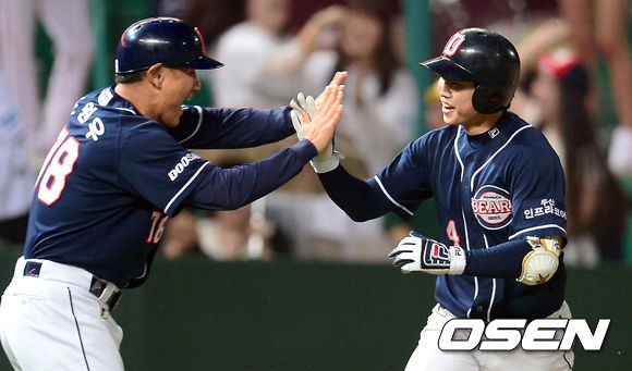 12일 오후 인천 문학구장에서 '2013 한국야쿠르트 세븐 프로야구' SK 와이번스와 두산 베어스의 경기, 9회초 2사 1,2루 두산 김동한이 SK 박희수를 상대로 역전 스리런 홈런을 때린 뒤 3루 조원우 코치와 기뻐하고 있다.