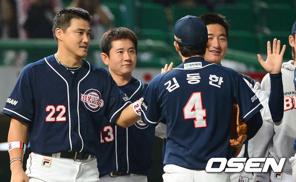 승리를 거둔 두산 홍성흔, 손시헌이 김동한과 하이파이브를 하고 있다./youngrae@osen.co.kr