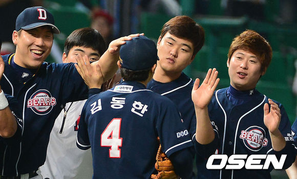 승리를 거둔 두산 김현수와 김동한이 기뻐하고 있다./youngrae@osen.co.kr