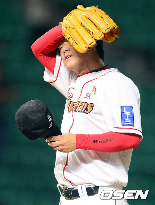 9회초 2사 1,2루 SK 박희수가 두산 김동한에게 역전 스리런을 허용한 뒤 땀을 닦고 있다./youngrae@osen.co.kr