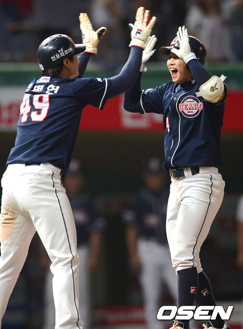 9회초 2사 1,2루 두산 김동한이 SK 박희수를 상대로 역전 스리런을 때린 뒤 동료들과 기뻐하고 있다./youngrae@osen.co.kr