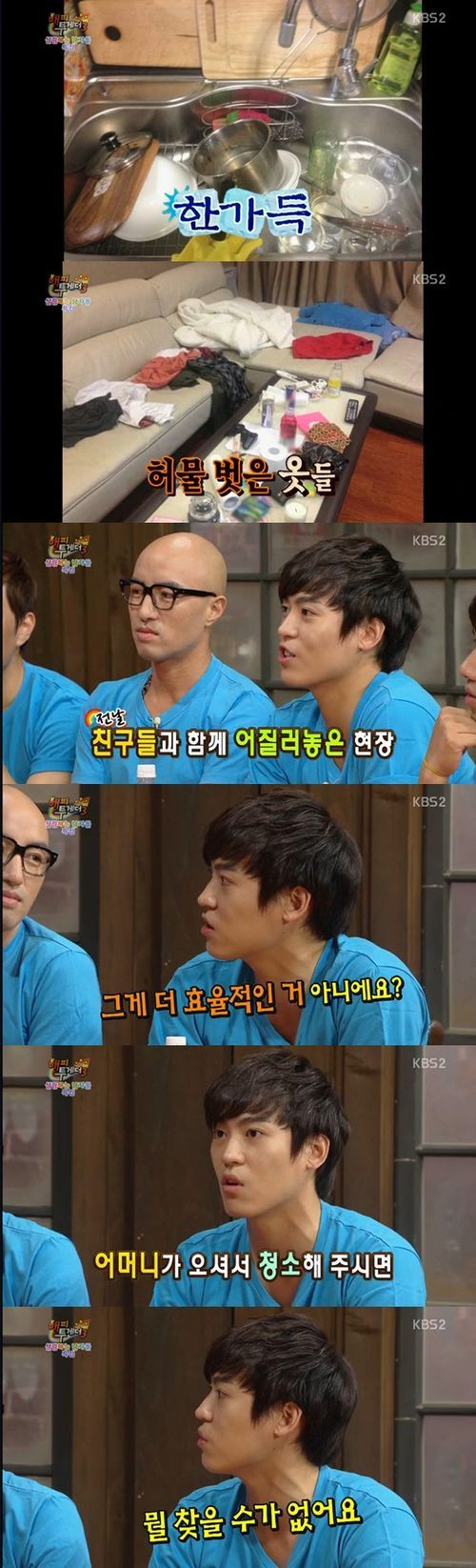 이날 한 달에 2번 정도 집을 치운다고 고백한 존박. 실제 존박의 집이 사진을 통해 공개되자, 출연자들은 경악을 금치 못했다. 싱크대에는 그릇이 가득 쌓여있고, 거실에는 옷이 늘어져 있었기 때문.