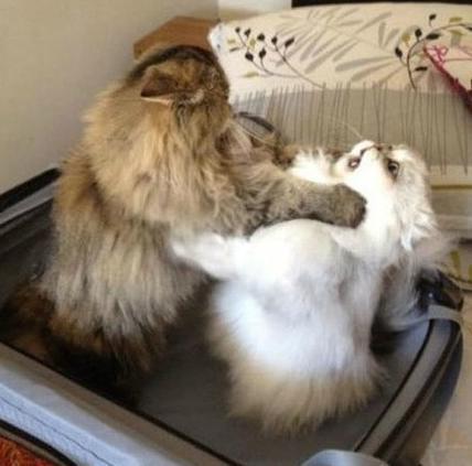 최근 온라인 커뮤니티를 중심으로 '멱살 잡은 고양이'라는 제목의 사진 한 장이 게재돼 화제다. 공개된 사진 속에는 침대 위에서 한창 몸싸움 중인 고양이 두 마리의 모습이 담겨있다.