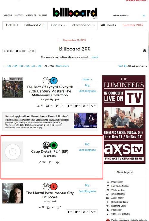 지드래곤은 지난해 발표한 미니앨범 ‘원 오브 어 카인드(ONE OF A KIND)’로 동일차트에서 161위를 기록한 바 있다. 또한 자신이 속한 그룹인 빅뱅의 ‘얼라이브(ALIVE)’ 앨범으로도 150위를 기록하기도 했다.