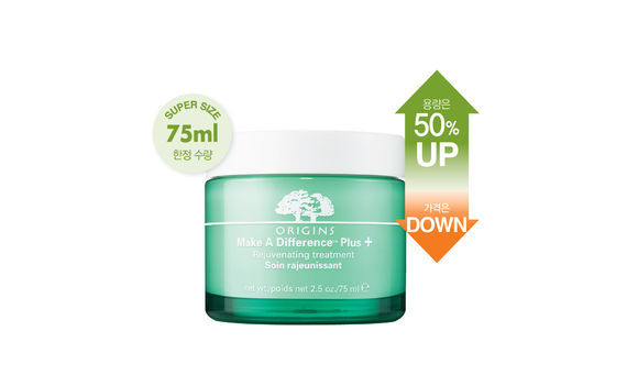 '메이크 어 디퍼런스 플러스+ 수분 트리트먼트' 대용량 75ml는 롯데 본점, 신세계 강남점, 현대 무역센터점 등 전국 백화점 오리진스 매장과 롯데닷컴, 신세계 몰, AK 몰 등에서 만나볼 수 있다. 가격은 5만 9000원 선.