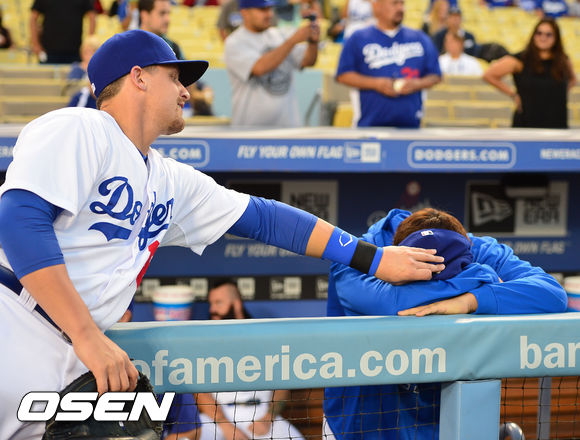 13일 (이하 한국시간) 미국 캘리포니아주 로스앤젤레스 다저스타디움에서 열린 2013 메이저리그 LA 다저스와 샌프란시스코 자이언츠의 경기, 다저스 류현진이 덕아웃에서 모자를 뒤집어쓰고 엎드려있자 팀 페데로위츠가 류현진을 위로하고 있다.